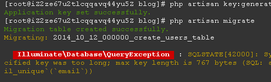 今天在Laravel5.2框架中执行php artisan migrate进行数据库迁移,但在创建操作中报错误SQLSTATE[42000],如下图所示:
